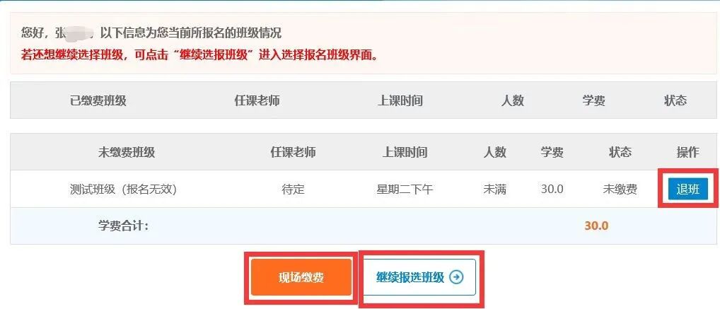 在确认报名班级页面,可以查看班级缴费与否,对未缴费的班级点击“退班”,点击“继续报选班级”返回选择班级,确定班级后,点击“现场缴费”。