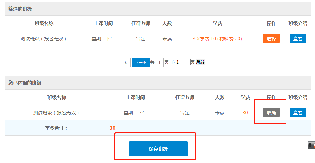 点击班级后方的“选择”按钮报名班级,在下方出现的已报名班级点击“取消”按钮取消报名,选好班级后点击“保存班级”按钮。
